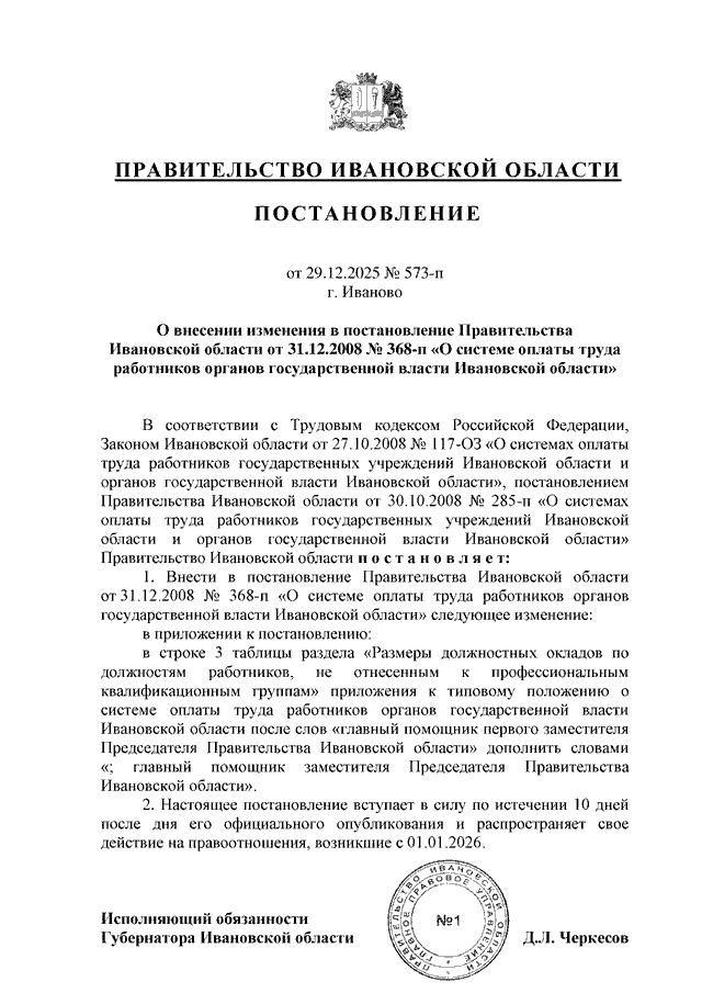 Постановление Правительства Ивановской области от 29.12.2025 N 573-п "О внесении изменения в постановление Правительства Ивановской области от 31.12.2008 N 368-п "О системе оплаты труда работников органов государственной власти Ивановской области"