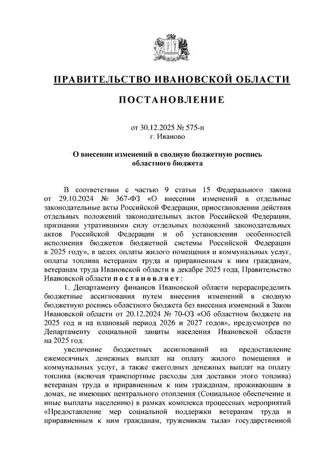 Постановление Правительства Ивановской области от 30.12.2025 N 575-п "О внесении изменений в сводную бюджетную роспись областного бюджета"