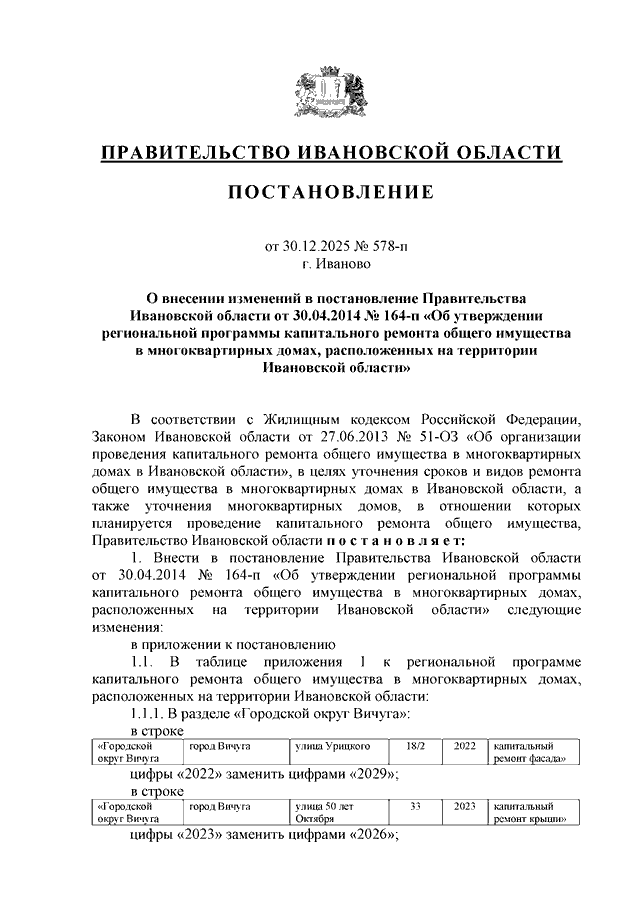 Постановление Правительства Ивановской области от 30.12.2025 N 578-п "О внесении изменений в постановление Правительства Ивановской области от 30.04.2014 N 164-п "Об утверждении региональной программы капитального ремонта общего имущества в многоквартирных домах, расположенных на территории Ивановской области"