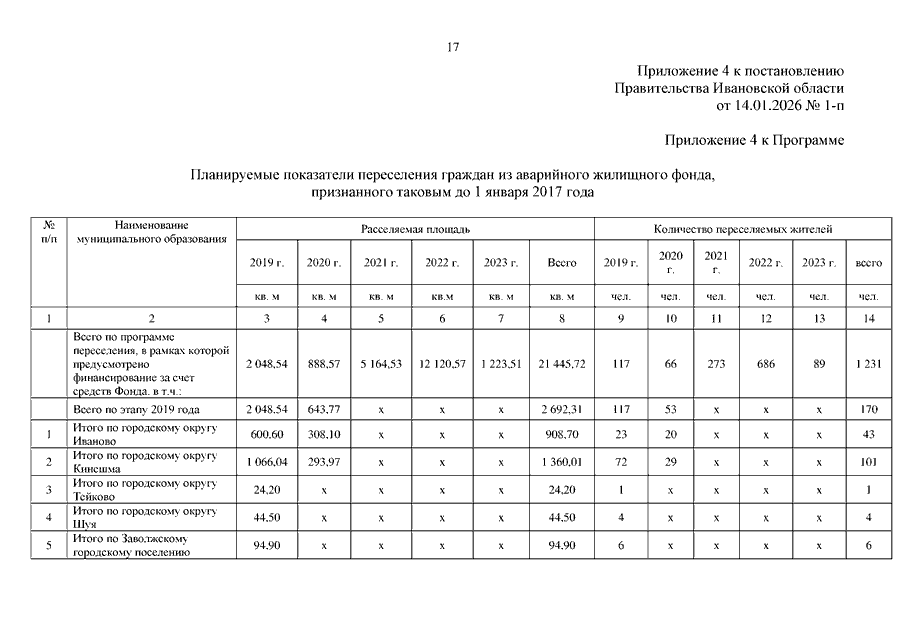 Постановление Правительства Ивановской области от 14.01.2026 N 1-п "О внесении изменений в постановление Правительства Ивановской области от 09.04.2019 N 131-п "Об утверждении региональной адресной программы "Переселение граждан из аварийного жилищного фонда на территории Ивановской области на 2019 - 2024 годы" (вместе с "Перечнем многоквартирных домов, признанных аварийными до 1 января 2017 года", "Планом реализации мероприятий по переселению граждан из аварийного жилищного фонда, признанного таковым до 1 января 2017 года, по способам переселения", "Планом мероприятий по переселению граждан из аварийного жилищного фонда, признанного таковым до 1 января 2017 года")