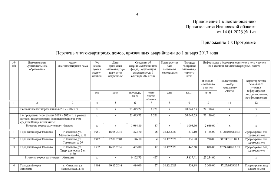 Постановление Правительства Ивановской области от 14.01.2026 N 1-п "О внесении изменений в постановление Правительства Ивановской области от 09.04.2019 N 131-п "Об утверждении региональной адресной программы "Переселение граждан из аварийного жилищного фонда на территории Ивановской области на 2019 - 2024 годы" (вместе с "Перечнем многоквартирных домов, признанных аварийными до 1 января 2017 года", "Планом реализации мероприятий по переселению граждан из аварийного жилищного фонда, признанного таковым до 1 января 2017 года, по способам переселения", "Планом мероприятий по переселению граждан из аварийного жилищного фонда, признанного таковым до 1 января 2017 года")