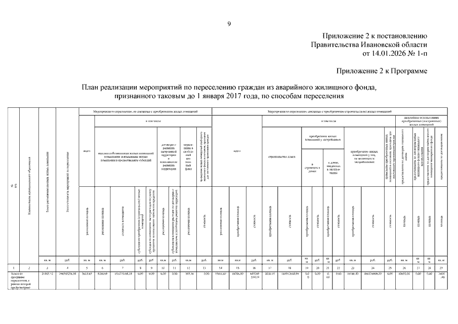 Постановление Правительства Ивановской области от 14.01.2026 N 1-п "О внесении изменений в постановление Правительства Ивановской области от 09.04.2019 N 131-п "Об утверждении региональной адресной программы "Переселение граждан из аварийного жилищного фонда на территории Ивановской области на 2019 - 2024 годы" (вместе с "Перечнем многоквартирных домов, признанных аварийными до 1 января 2017 года", "Планом реализации мероприятий по переселению граждан из аварийного жилищного фонда, признанного таковым до 1 января 2017 года, по способам переселения", "Планом мероприятий по переселению граждан из аварийного жилищного фонда, признанного таковым до 1 января 2017 года")
