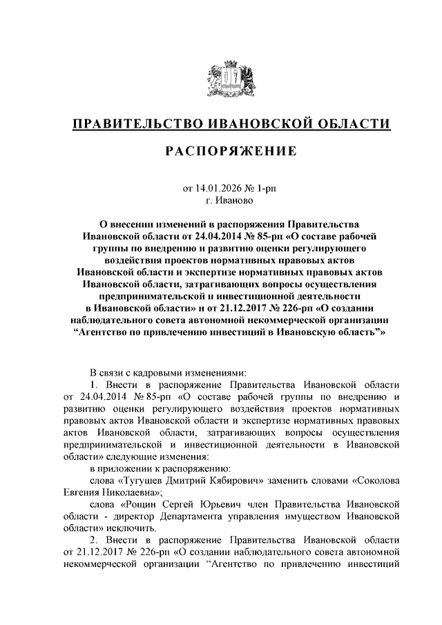 Распоряжение Правительства Ивановской области от 14.01.2026 N 1-рп "О внесении изменений в распоряжения Правительства Ивановской области от 24.04.2014 N 85-рп "О составе рабочей группы по внедрению и развитию оценки регулирующего воздействия проектов нормативных правовых актов Ивановской области и экспертизе нормативных правовых актов Ивановской области, затрагивающих вопросы осуществления предпринимательской и инвестиционной деятельности в Ивановской области" и от 21.12.2017 N 226-рп "О создании наблюдательного совета автономной некоммерческой организации "Агентство по привлечению инвестиций в Ивановскую область"