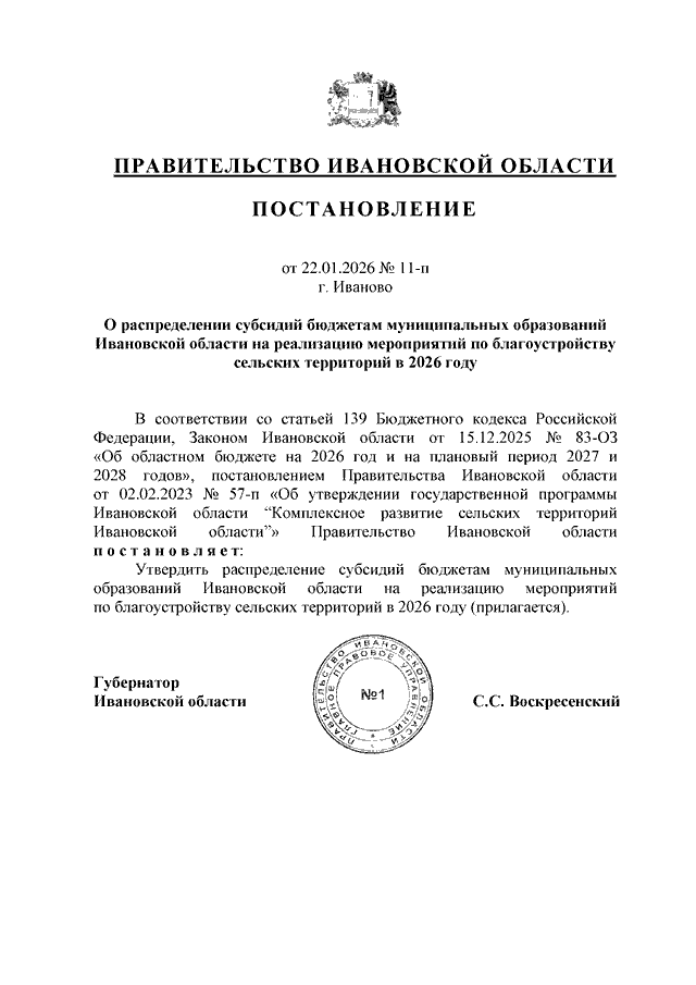 Постановление Правительства Ивановской области от 22.01.2026 N 11-п "О распределении субсидий бюджетам муниципальных образований Ивановской области на реализацию мероприятий по благоустройству сельских территорий в 2026 году"