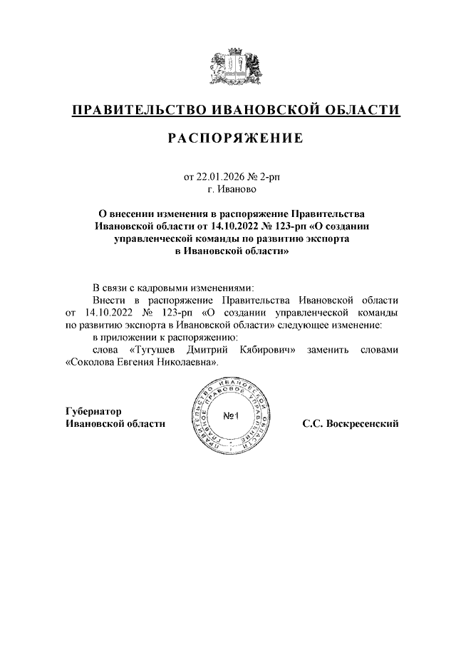 Распоряжение Правительства Ивановской области от 22.01.2026 N 2-рп "О внесении изменения в распоряжение Правительства Ивановской области от 14.10.2022 N 123-рп "О создании управленческой команды по развитию экспорта в Ивановской области"