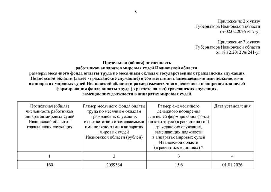 Указ Губернатора Ивановской области от 02.02.2026 N 7-уг "О внесении изменений в указ Губернатора Ивановской области от 18.12.2012 N 241-уг "О предельной численности, фонде оплаты труда и ежемесячном денежном поощрении государственных гражданских служащих Ивановской области"