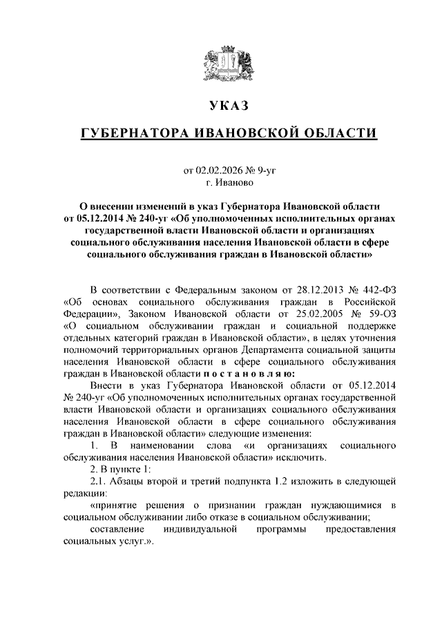Указ Губернатора Ивановской области от 02.02.2026 N 9-уг "О внесении изменений в указ Губернатора Ивановской области от 05.12.2014 N 240-уг "Об уполномоченных исполнительных органах государственной власти Ивановской области и организациях социального обслуживания населения Ивановской области в сфере социального обслуживания граждан в Ивановской области"