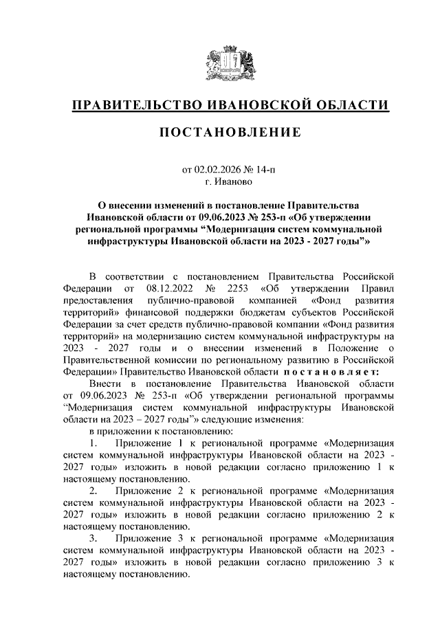 Постановление Правительства Ивановской области от 02.02.2026 N 14-п "О внесении изменений в постановление Правительства Ивановской области от 09.06.2023 N 253-п "Об утверждении региональной программы "Модернизация систем коммунальной инфраструктуры Ивановской области на 2023 - 2027 годы" (вместе с "Перечнем значений целевых показателей региональной программы "Модернизация систем коммунальной инфраструктуры Ивановской области на 2023 - 2027 годы", "Планом реализации региональной программы "Модернизация систем коммунальной инфраструктуры Ивановской области на 2023 - 2027 годы")