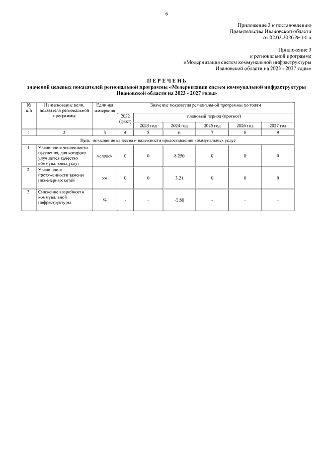 Постановление Правительства Ивановской области от 02.02.2026 N 14-п "О внесении изменений в постановление Правительства Ивановской области от 09.06.2023 N 253-п "Об утверждении региональной программы "Модернизация систем коммунальной инфраструктуры Ивановской области на 2023 - 2027 годы" (вместе с "Перечнем значений целевых показателей региональной программы "Модернизация систем коммунальной инфраструктуры Ивановской области на 2023 - 2027 годы", "Планом реализации региональной программы "Модернизация систем коммунальной инфраструктуры Ивановской области на 2023 - 2027 годы")