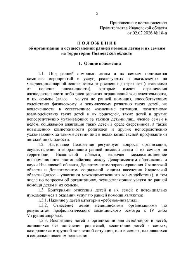 Постановление Правительства Ивановской области от 02.02.2026 N 18-п "Об утверждении Положения об организации и осуществлении ранней помощи детям и их семьям на территории Ивановской области"