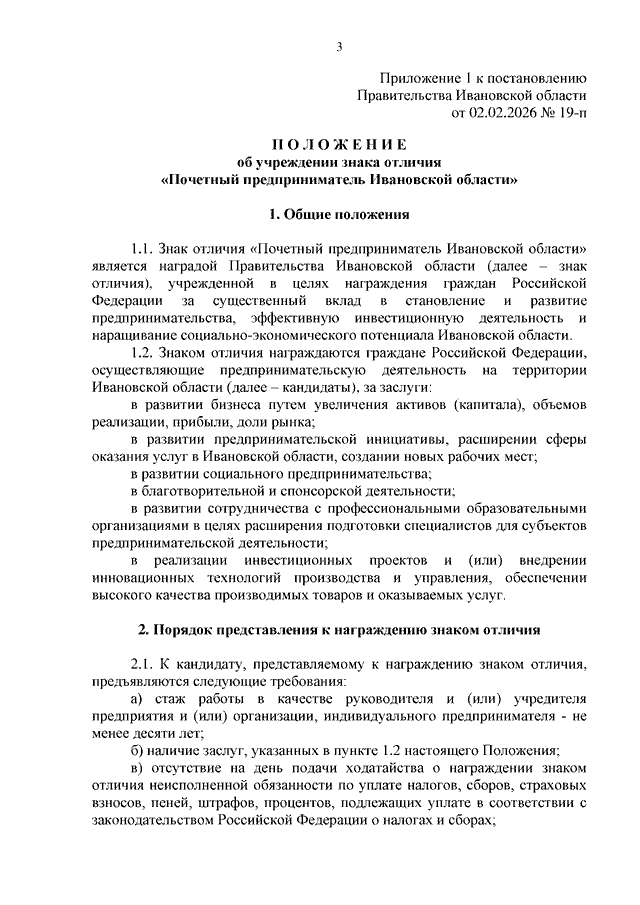 Постановление Правительства Ивановской области от 02.02.2026 N 19-п "Об учреждении награды Правительства Ивановской области - знака отличия "Почетный предприниматель Ивановской области" (вместе с "Положением об учреждении знака отличия "Почетный предприниматель Ивановской области")