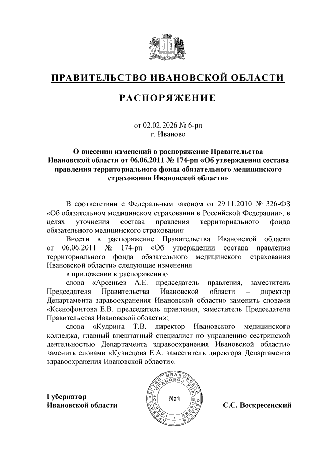 Распоряжение Правительства Ивановской области от 02.02.2026 N 6-рп "О внесении изменений в распоряжение Правительства Ивановской области от 06.06.2011 N 174-рп "Об утверждении состава правления территориального фонда обязательного медицинского страхования Ивановской области"