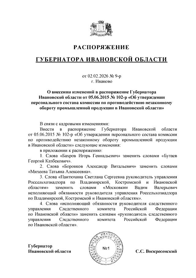 Распоряжение Губернатора Ивановской области от 02.02.2026 N 9-р "О внесении изменений в распоряжение Губернатора Ивановской области от 05.06.2015 N 102-р "Об утверждении персонального состава комиссии по противодействию незаконному обороту промышленной продукции в Ивановской области"