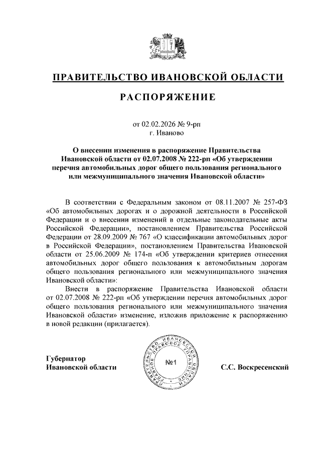 Распоряжение Правительства Ивановской области от 02.02.2026 N 9-рп "О внесении изменения в распоряжение Правительства Ивановской области от 02.07.2008 N 222-рп "Об утверждении перечня автомобильных дорог общего пользования регионального или межмуниципального значения Ивановской области"