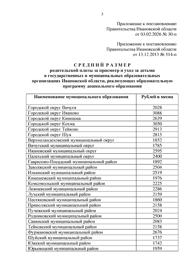 Постановление Правительства Ивановской области от 03.02.2026 N 30-п "О внесении изменения в постановление Правительства Ивановской области от 13.12.2013 N 514-п "Об установлении среднего размера родительской платы за присмотр и уход за детьми в государственных и муниципальных образовательных организациях Ивановской области, реализующих образовательную программу дошкольного образования"