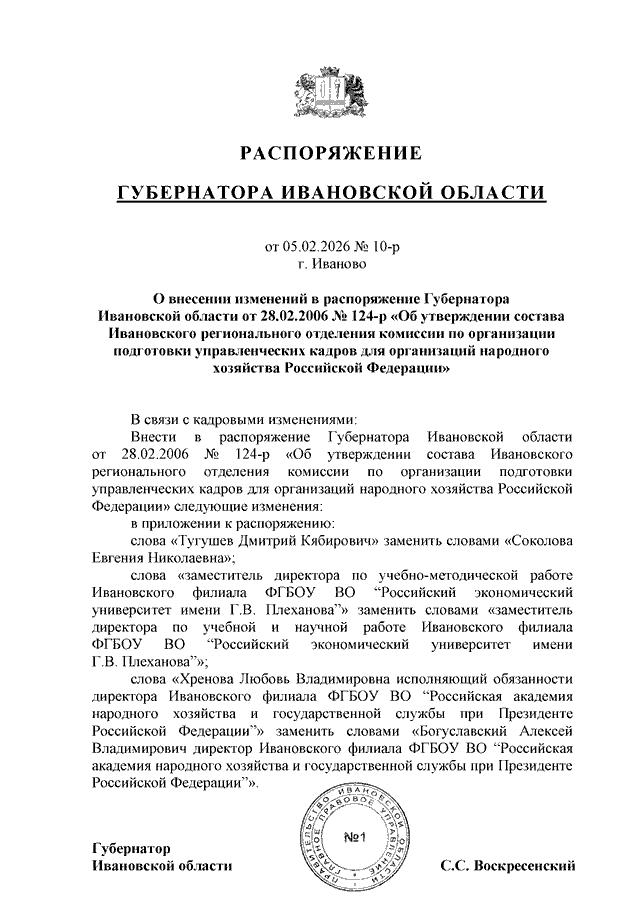 Распоряжение Губернатора Ивановской области от 05.02.2026 N 10-р "О внесении изменений в распоряжение Губернатора Ивановской области от 28.02.2006 N 124-р "Об утверждении состава Ивановского регионального отделения комиссии по организации подготовки управленческих кадров для организаций народного хозяйства Российской Федерации"
