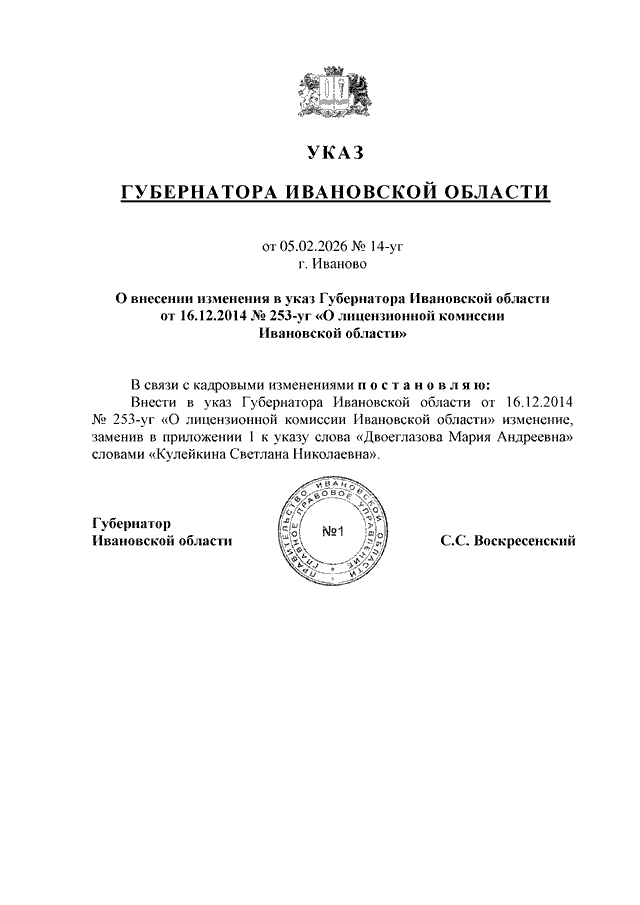 Указ Губернатора Ивановской области от 05.02.2026 N 14-уг "О внесении изменения в указ Губернатора Ивановской области от 16.12.2014 N 253-уг "О лицензионной комиссии Ивановской области"