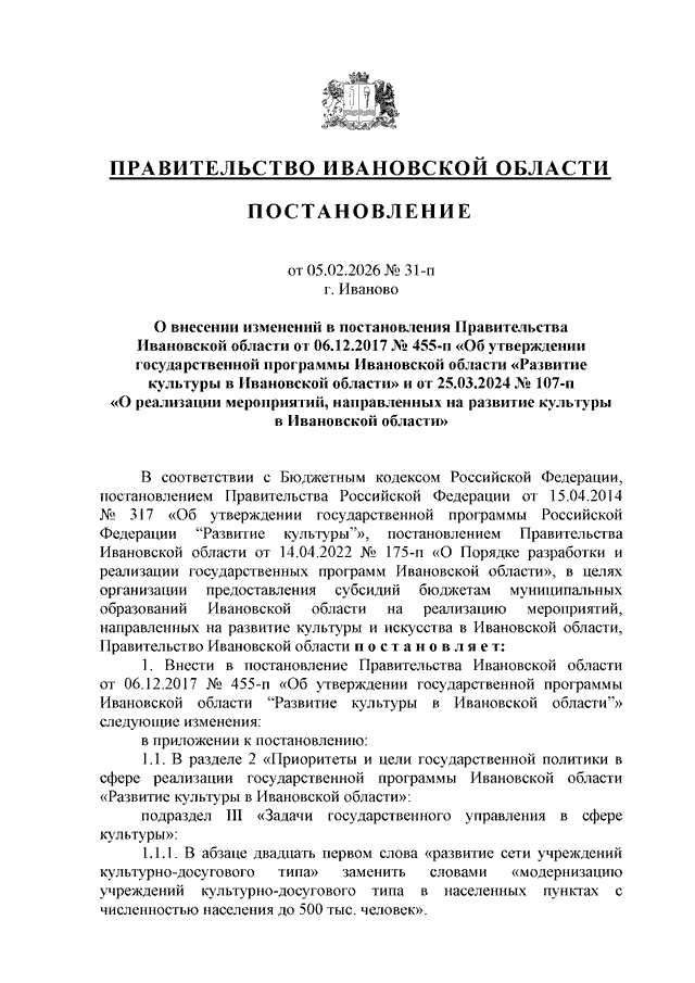 Постановление Правительства Ивановской области от 05.02.2026 N 31-п "О внесении изменений в постановления Правительства Ивановской области от 06.12.2017 N 455-п "Об утверждении государственной программы Ивановской области "Развитие культуры в Ивановской области" и от 25.03.2024 N 107-п "О реализации мероприятий, направленных на развитие культуры в Ивановской области" (вместе с "Порядком предоставления и распределения субсидий бюджетам муниципальных образований Ивановской области на модернизацию учреждений культуры, включая создание детских культурно-просветительских центров на базе учреждений культуры")