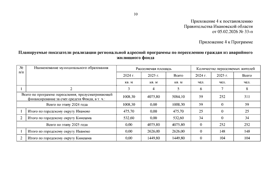 Постановление Правительства Ивановской области от 05.02.2026 N 33-п "О внесении изменений в постановление Правительства Ивановской области от 03.06.2024 N 232-п "Об утверждении региональной адресной программы "Переселение граждан из аварийного жилищного фонда на территории Ивановской области на 2024 - 2030 годы" (вместе с "Реестром жилищного фонда (многоквартирные дома, дома блокированной застройки, объекты индивидуального жилищного строительства)", "Планом реализации мероприятий по переселению граждан из аварийного жилищного фонда по способам переселения")