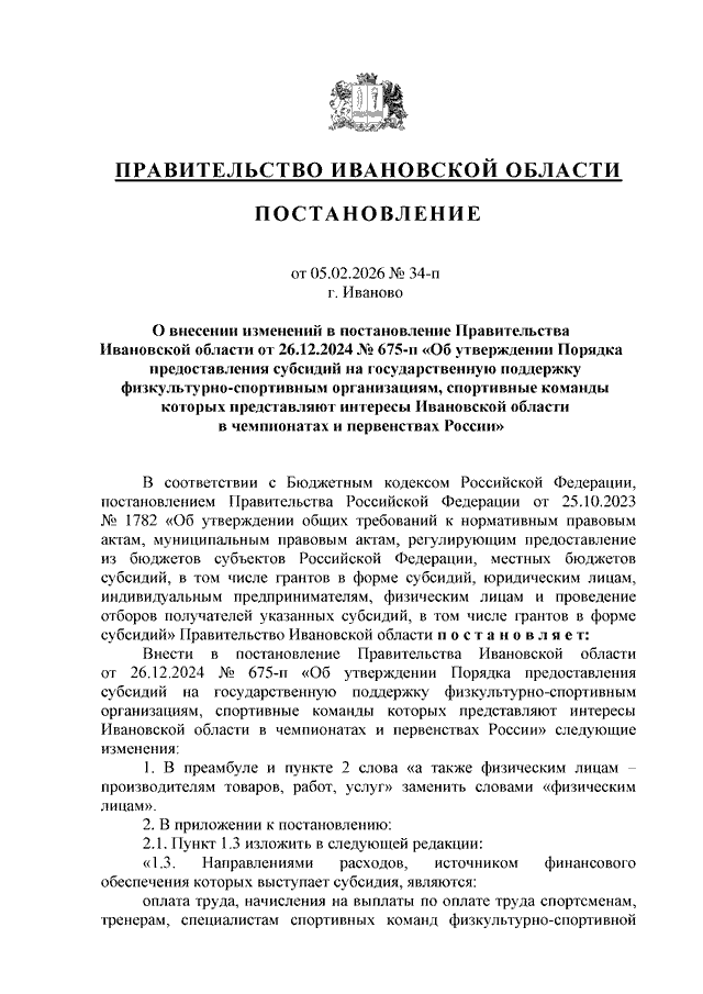 Постановление Правительства Ивановской области от 05.02.2026 N 34-п "О внесении изменений в постановление Правительства Ивановской области от 26.12.2024 N 675-п "Об утверждении Порядка предоставления субсидий на государственную поддержку физкультурно-спортивным организациям, спортивные команды которых представляют интересы Ивановской области в чемпионатах и первенствах России"