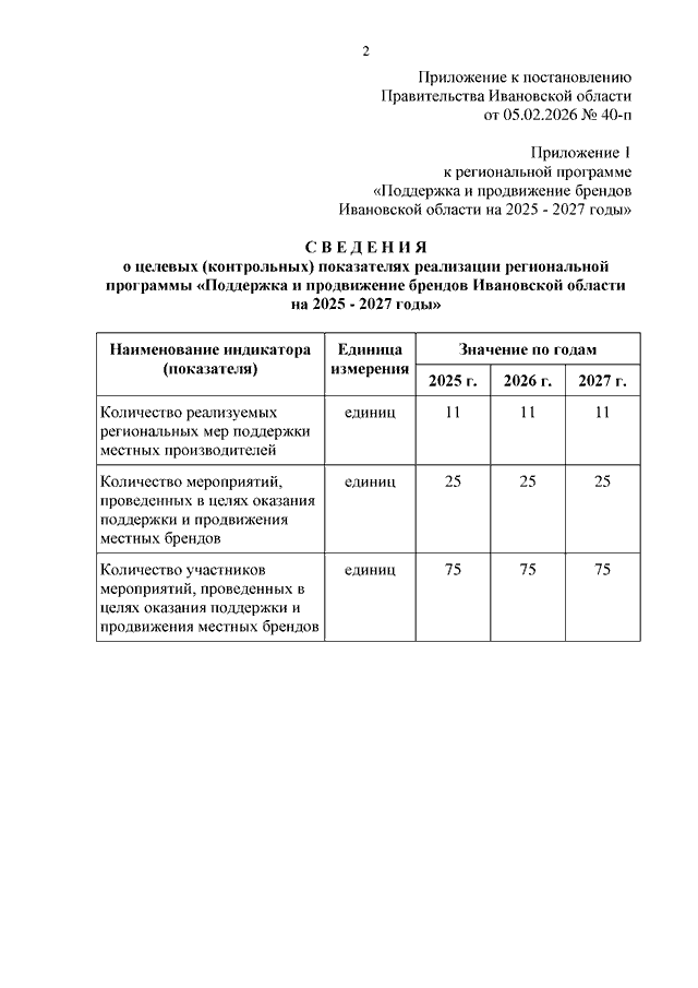 Постановление Правительства Ивановской области от 05.02.2026 N 40-п "О внесении изменений в постановление Правительства Ивановской области от 27.03.2025 N 116-п "Об утверждении Региональной программы "Поддержка и продвижение брендов Ивановской области на 2025 - 2027 годы"