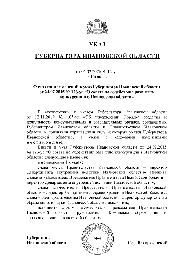 Указ Губернатора Ивановской области от 05.02.2026 N 12-уг "О внесении изменений в указ Губернатора Ивановской области от 24.07.2015 N 126-уг "О совете по содействию развитию конкуренции в Ивановской области"