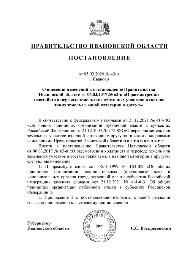 Постановление Правительства Ивановской области от 05.02.2026 N 42-п "О внесении изменений в постановление Правительства Ивановской области от 06.03.2017 N 63-п "О рассмотрении ходатайств о переводе земель или земельных участков в составе таких земель из одной категории в другую"