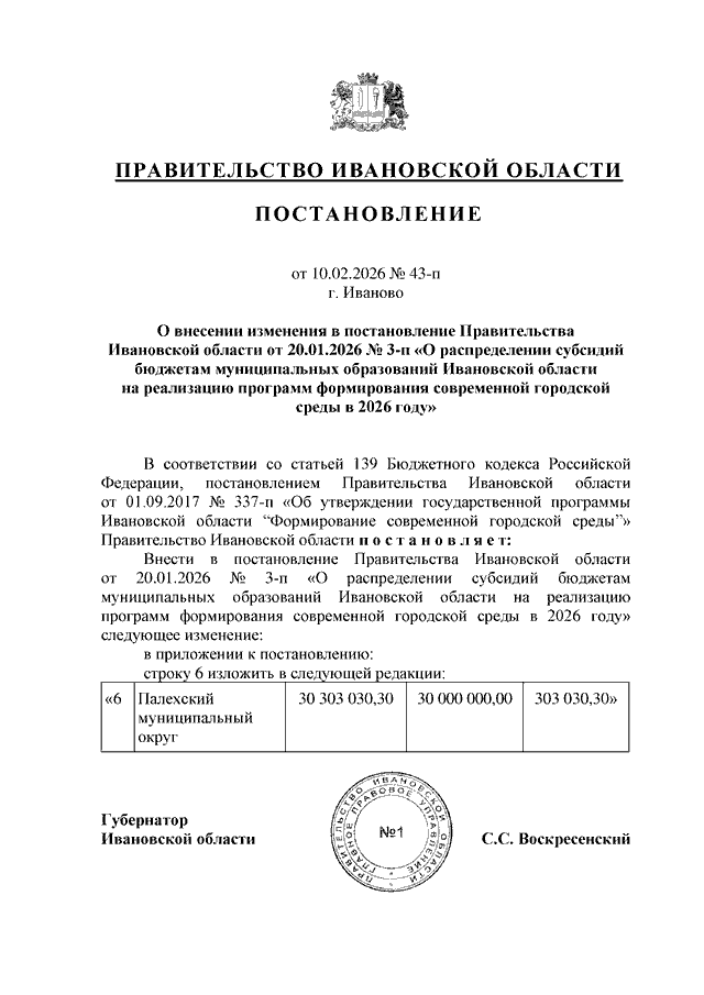 Постановление Правительства Ивановской области от 10.02.2026 N 43-п "О внесении изменения в постановление Правительства Ивановской области от 20.01.2026 N 3-п "О распределении субсидий бюджетам муниципальных образований Ивановской области на реализацию программ формирования современной городской среды в 2026 году"