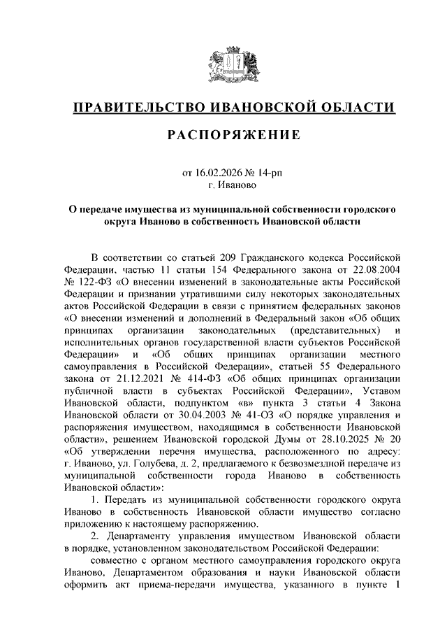 Распоряжение Правительства Ивановской области от 16.02.2026 N 14-рп "О передаче имущества из муниципальной собственности городского округа Иваново в собственность Ивановской области"