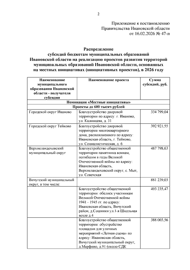 Постановление Правительства Ивановской области от 16.02.2026 N 47-п "О распределении субсидий бюджетам муниципальных образований Ивановской области на реализацию проектов развития территорий муниципальных образований Ивановской области, основанных на местных инициативах (инициативных проектов), в 2026 году"
