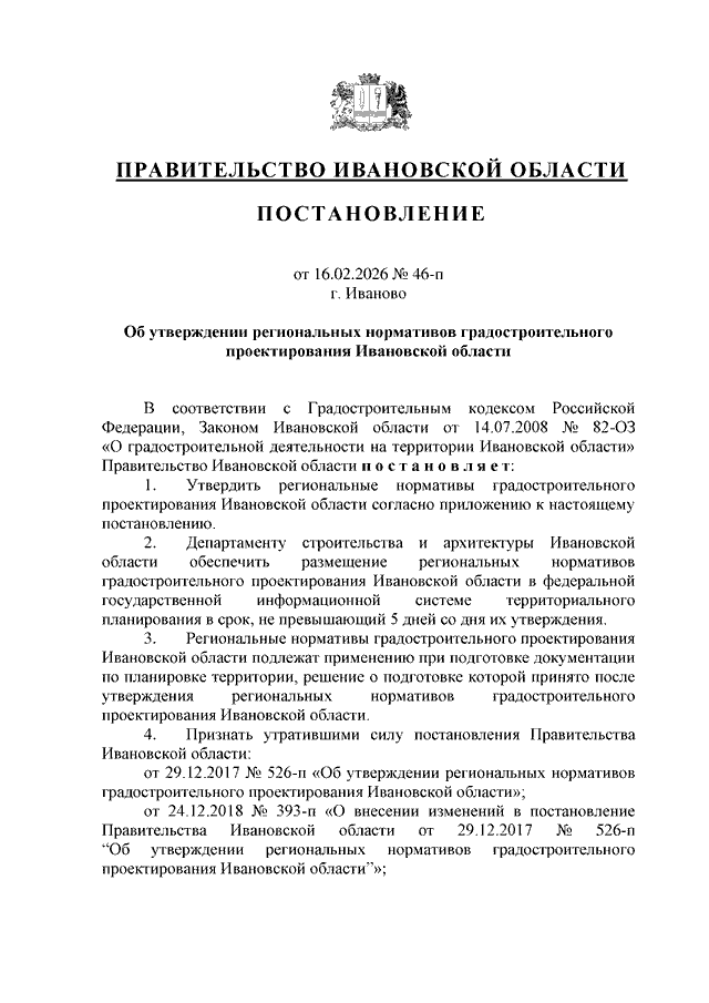 Постановление Правительства Ивановской области от 16.02.2026 N 46-п "Об утверждении региональных нормативов градостроительного проектирования Ивановской области"