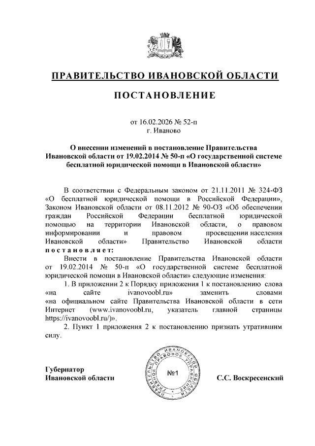 Постановление Правительства Ивановской области от 16.02.2026 N 52-п "О внесении изменений в постановление Правительства Ивановской области от 19.02.2014 N 50-п "О государственной системе бесплатной юридической помощи в Ивановской области"