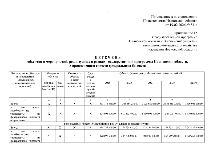 Постановление Правительства Ивановской области от 19.02.2026 N 54-п "О внесении изменений в постановление Правительства Ивановской области от 06.12.2017 N 458-п "Об утверждении государственной программы Ивановской области "Обеспечение услугами жилищно-коммунального хозяйства населения Ивановской области" (вместе с "Перечнем объектов и мероприятий, реализуемых в рамках государственной программы Ивановской области, с привлечением средств федерального бюджета")