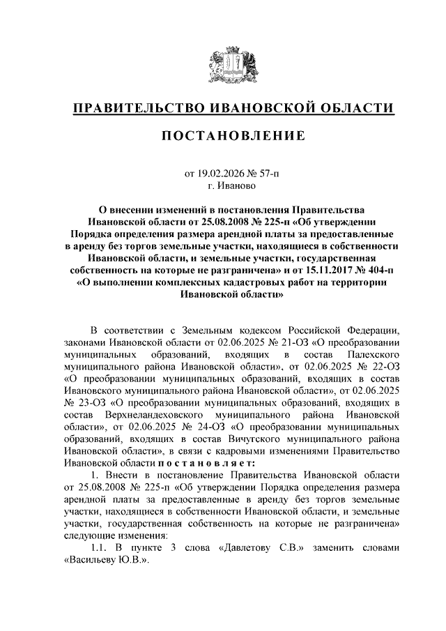 Постановление Правительства Ивановской области от 19.02.2026 N 57-п "О внесении изменений в постановления Правительства Ивановской области от 25.08.2008 N 225-п "Об утверждении Порядка определения размера арендной платы за предоставленные в аренду без торгов земельные участки, находящиеся в собственности Ивановской области, и земельные участки, государственная собственность на которые не разграничена" и от 15.11.2017 N 404-п "О выполнении комплексных кадастровых работ на территории Ивановской области"