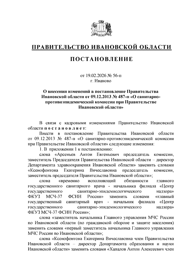 Постановление Правительства Ивановской области от 19.02.2026 N 56-п "О внесении изменений в постановление Правительства Ивановской области от 09.12.2013 N 487-п "О санитарно-противоэпидемической комиссии при Правительстве Ивановской области"