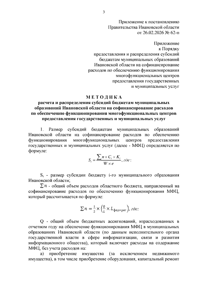 Постановление Правительства Ивановской области от 26.02.2026 N 62-п "О внесении изменений в постановление Правительства Ивановской области от 13.11.2013 N 456-п "Об утверждении государственной программы Ивановской области "Развитие цифровой экономики и информатизации Ивановской области" (вместе с "Методикой расчета и распределения субсидий бюджетам муниципальных образований Ивановской области на софинансирование расходов по обеспечению функционирования многофункциональных центров предоставления государственных и муниципальных услуг")
