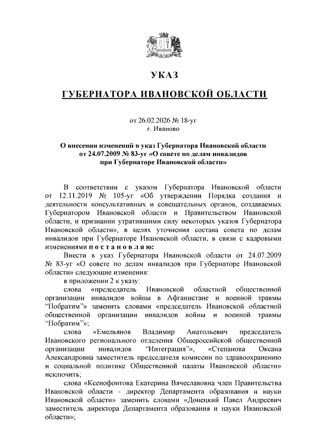 Указ Губернатора Ивановской области от 26.02.2026 N 18-уг "О внесении изменений в указ Губернатора Ивановской области от 24.07.2009 N 83-уг "О совете по делам инвалидов при Губернаторе Ивановской области"