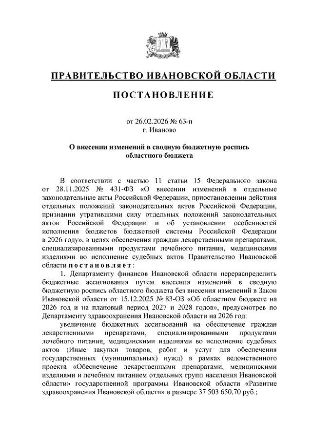 Постановление Правительства Ивановской области от 26.02.2026 N 63-п "О внесении изменений в сводную бюджетную роспись областного бюджета"