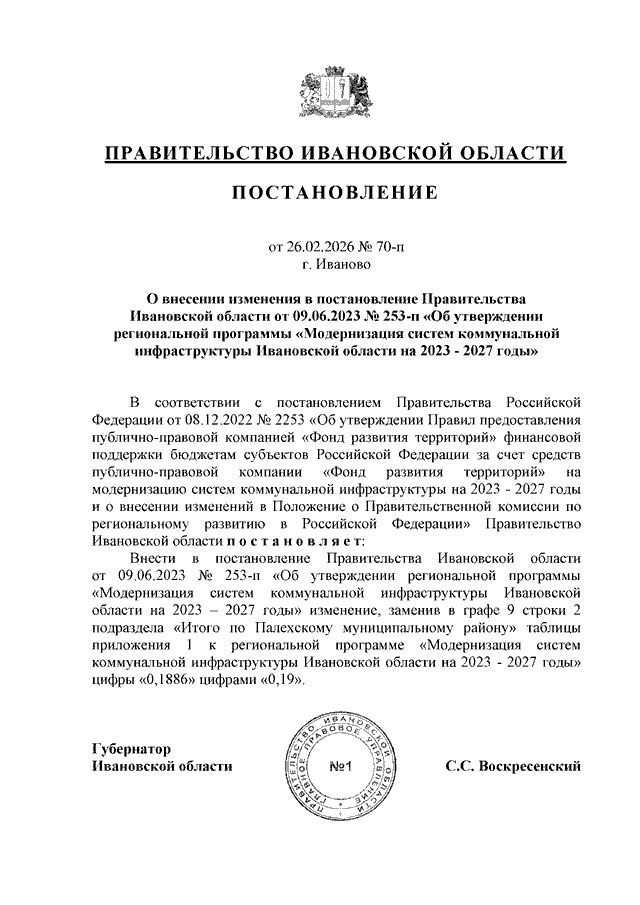 Постановление Правительства Ивановской области от 26.02.2026 N 70-п "О внесении изменения в постановление Правительства Ивановской области от 09.06.2023 N 253-п "Об утверждении региональной программы "Модернизация систем коммунальной инфраструктуры Ивановской области на 2023 - 2027 годы"