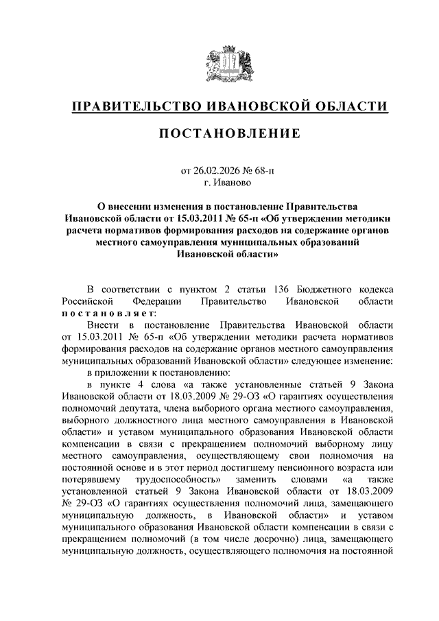 Постановление Правительства Ивановской области от 26.02.2026 N 68-п "О внесении изменения в постановление Правительства Ивановской области от 15.03.2011 N 65-п "Об утверждении методики расчета нормативов формирования расходов на содержание органов местного самоуправления муниципальных образований Ивановской области"