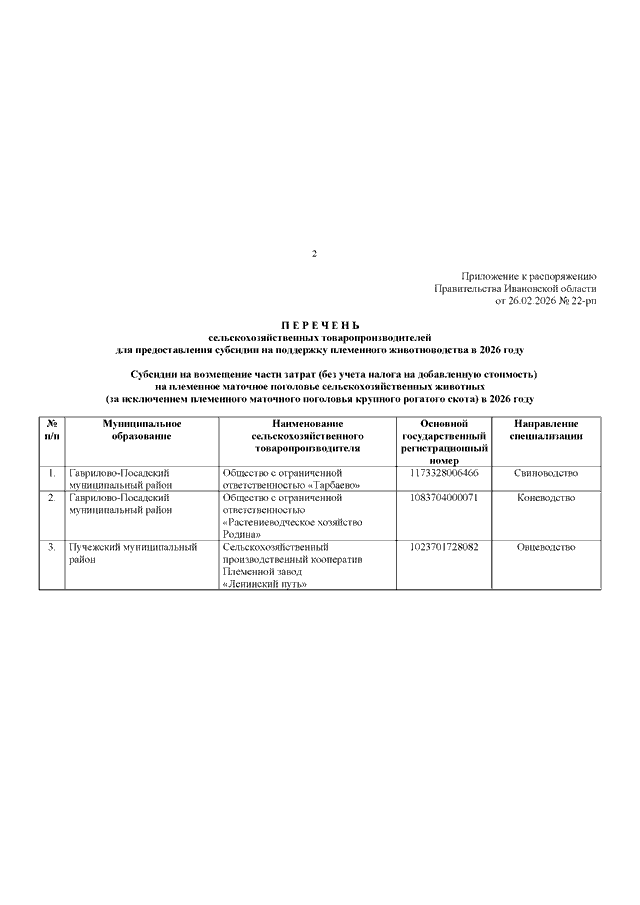 Распоряжение Правительства Ивановской области от 26.02.2026 N 22-рп "Об утверждении Перечня племенных хозяйств для предоставления субсидии на поддержку племенного животноводства в 2026 году" (вместе с "Перечнем сельскохозяйственных товаропроизводителей для предоставления субсидии на поддержку племенного животноводства в 2026 году")