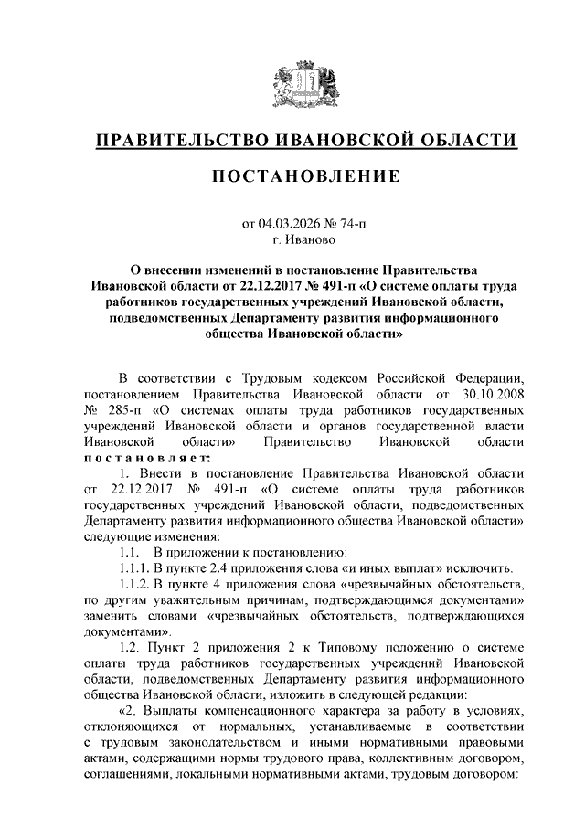 Постановление Правительства Ивановской области от 04.03.2026 N 74-п "О внесении изменений в постановление Правительства Ивановской области от 22.12.2017 N 491-п "О системе оплаты труда работников государственных учреждений Ивановской области, подведомственных Департаменту развития информационного общества Ивановской области"