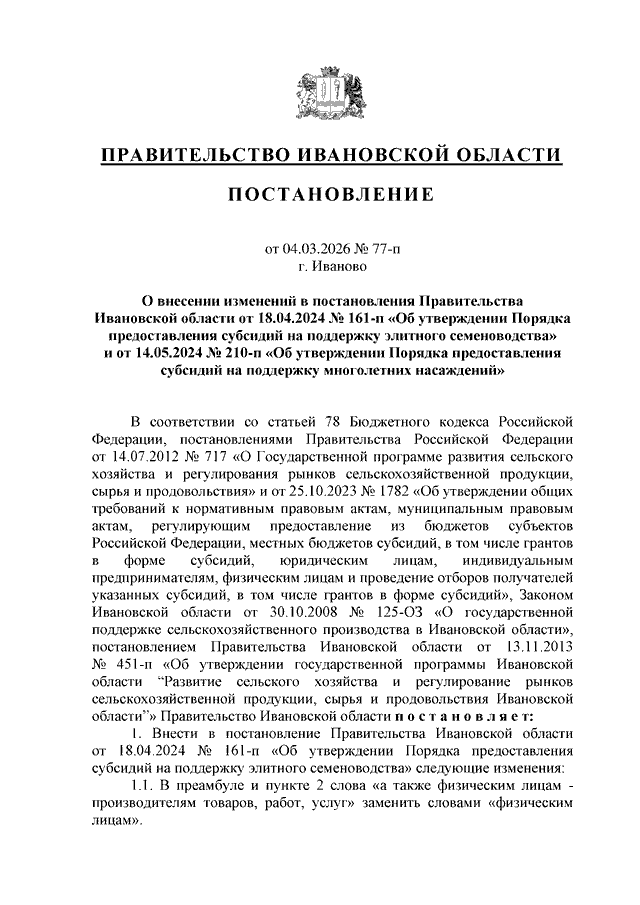 Постановление Правительства Ивановской области от 04.03.2026 N 77-п "О внесении изменений в постановления Правительства Ивановской области от 18.04.2024 N 161-п "Об утверждении Порядка предоставления субсидий на поддержку элитного семеноводства" и от 14.05.2024 N 210-п "Об утверждении Порядка предоставления субсидий на поддержку многолетних насаждений"