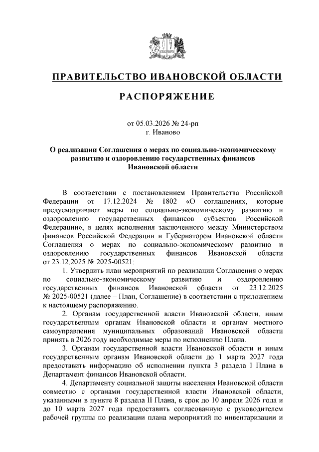 Распоряжение Правительства Ивановской области от 05.03.2026 N 24-рп "О реализации Соглашения о мерах по социально-экономическому развитию и оздоровлению государственных финансов Ивановской области" (вместе с "Планом мероприятий по реализации соглашения о мерах по социально-экономическому развитию и оздоровлению государственных финансов Ивановской области от 23.12.2025 N 2025-00521")