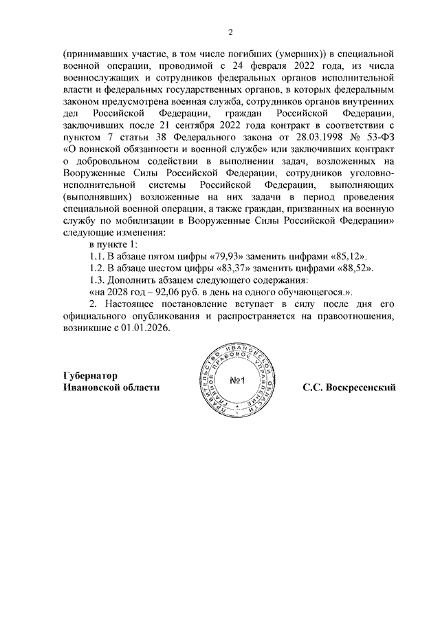 Постановление Правительства Ивановской области от 05.03.2026 N 80-п "О внесении изменений в постановление Правительства Ивановской области от 24.10.2023 N 489-п "Об установлении стоимости горячего питания обучающихся, получающих начальное общее, основное общее и среднее общее образование в муниципальных образовательных организациях, из числа детей, пасынков и падчериц граждан, принимающих участие (принимавших участие, в том числе погибших (умерших)) в специальной военной операции, проводимой с 24 февраля 2022 года, из числа военнослужащих и сотрудников федеральных органов исполнительной власти и федеральных государственных органов, в которых федеральным законом предусмотрена военная служба, сотрудников органов внутренних дел Российской Федерации, граждан Российской Федерации, заключивших после 21 сентября 2022 года контракт в соответствии с пунктом 7 статьи 38 Федерального закона от 28.03.1998 N 53-ФЗ "О воинской обязанности и военной службе" или заключивших контракт о добровольном содействии в выполнении задач, возложенных на Вооруженные Силы Российской Федерации, сотрудников уголовно-исполнительной системы Российской Федерации, выполняющих (выполнявших) возложенные на них задачи в период проведения специальной военной операции, а также граждан, призванных на военную службу по мобилизации в Вооруженные Силы Российской Федерации"