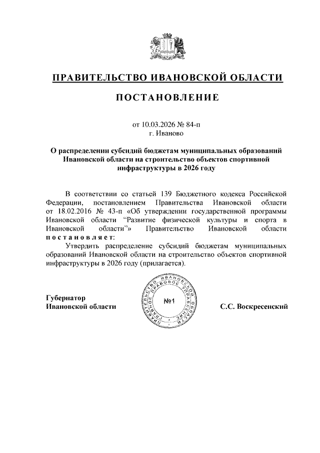 Постановление Правительства Ивановской области от 10.03.2026 N 84-п "О распределении субсидий бюджетам муниципальных образований Ивановской области на строительство объектов спортивной инфраструктуры в 2026 году"