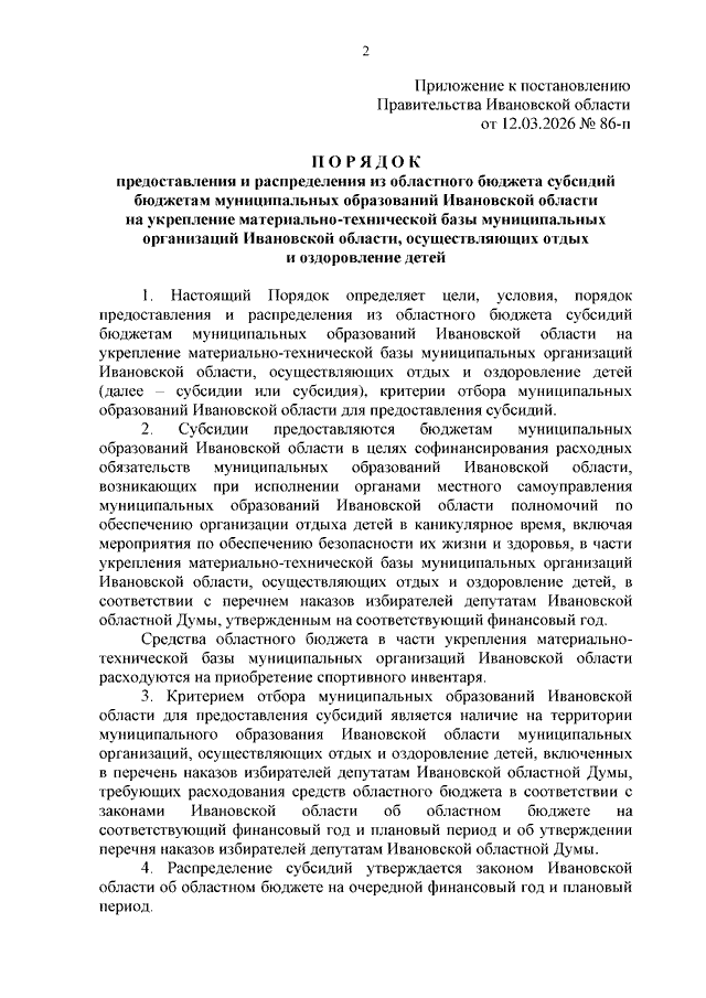 Постановление Правительства Ивановской области от 12.03.2026 N 86-п "Об утверждении Порядка предоставления и распределения из областного бюджета субсидий бюджетам муниципальных образований Ивановской области на укрепление материально-технической базы муниципальных организаций Ивановской области, осуществляющих отдых и оздоровление детей"