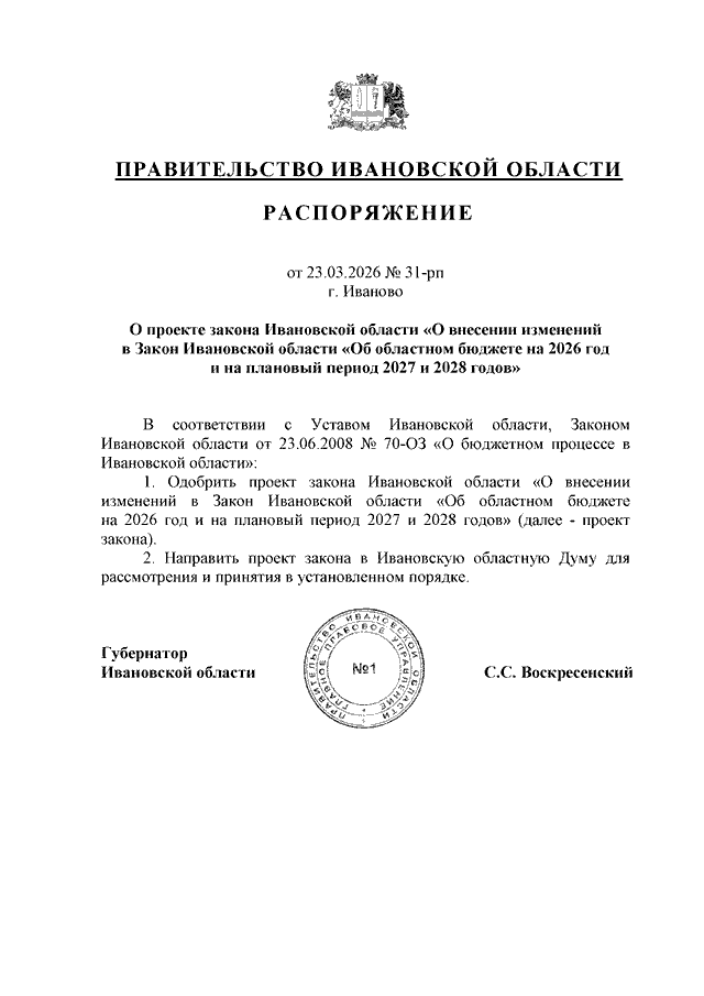 Распоряжение Правительства Ивановской области от 23.03.2026 N 31-рп "О проекте закона Ивановской области "О внесении изменений в Закон Ивановской области "Об областном бюджете на 2026 год и на плановый период 2027 и 2028 годов"