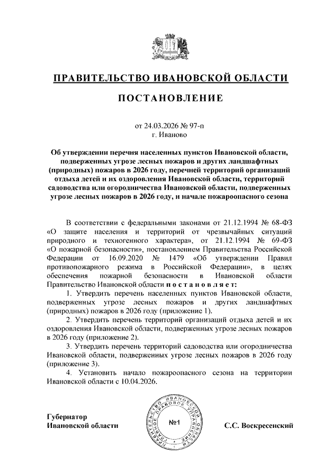 Постановление Правительства Ивановской области от 24.03.2026 N 97-п "Об утверждении перечня населенных пунктов Ивановской области, подверженных угрозе лесных пожаров и других ландшафтных (природных) пожаров в 2026 году, перечней территорий организаций отдыха детей и их оздоровления Ивановской области, территорий садоводства или огородничества Ивановской области, подверженных угрозе лесных пожаров в 2026 году, и начале пожароопасного сезона"