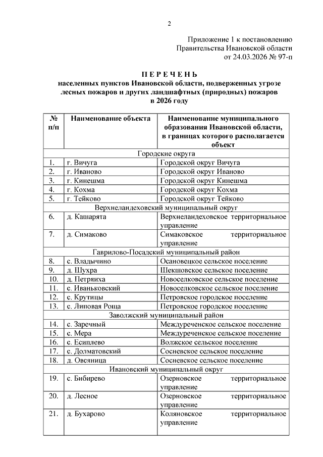 Постановление Правительства Ивановской области от 24.03.2026 N 97-п "Об утверждении перечня населенных пунктов Ивановской области, подверженных угрозе лесных пожаров и других ландшафтных (природных) пожаров в 2026 году, перечней территорий организаций отдыха детей и их оздоровления Ивановской области, территорий садоводства или огородничества Ивановской области, подверженных угрозе лесных пожаров в 2026 году, и начале пожароопасного сезона"